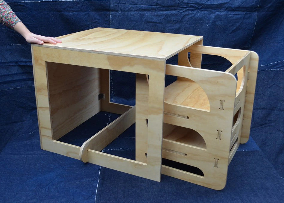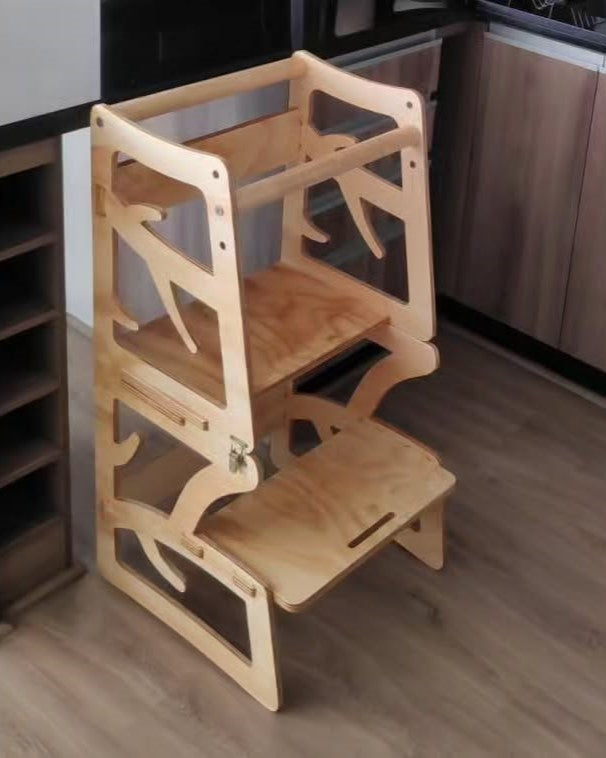 Inspirada en las ramas de un bosque, esta torre fomenta la autonomía infantil. Su estructura segura y transformable permite usarla como torre, mesa o silla, acompañando el desarrollo diario.