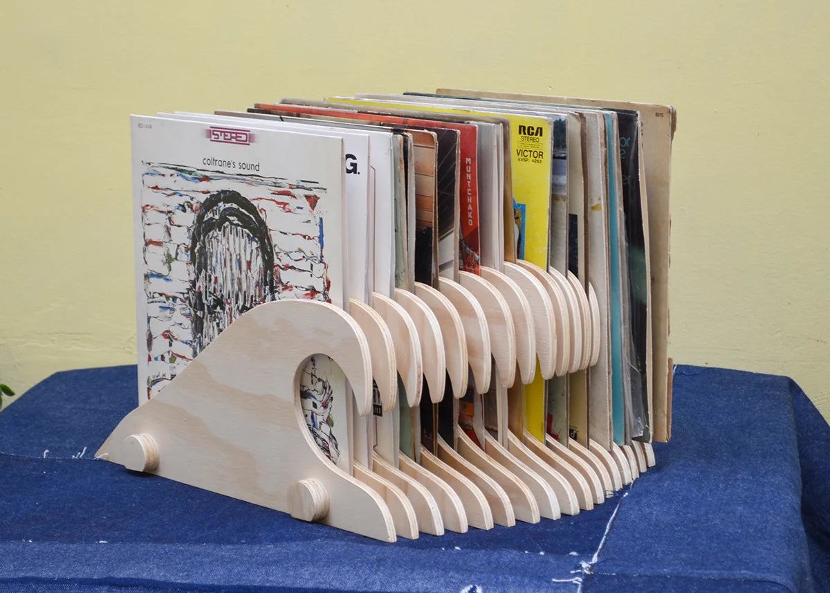 Inspirado en las olas del Pacífico, este soporte almacena hasta 16 vinilos en posición vertical. Combina organización práctica con un diseño curvo que aporta estilo decorativo único.