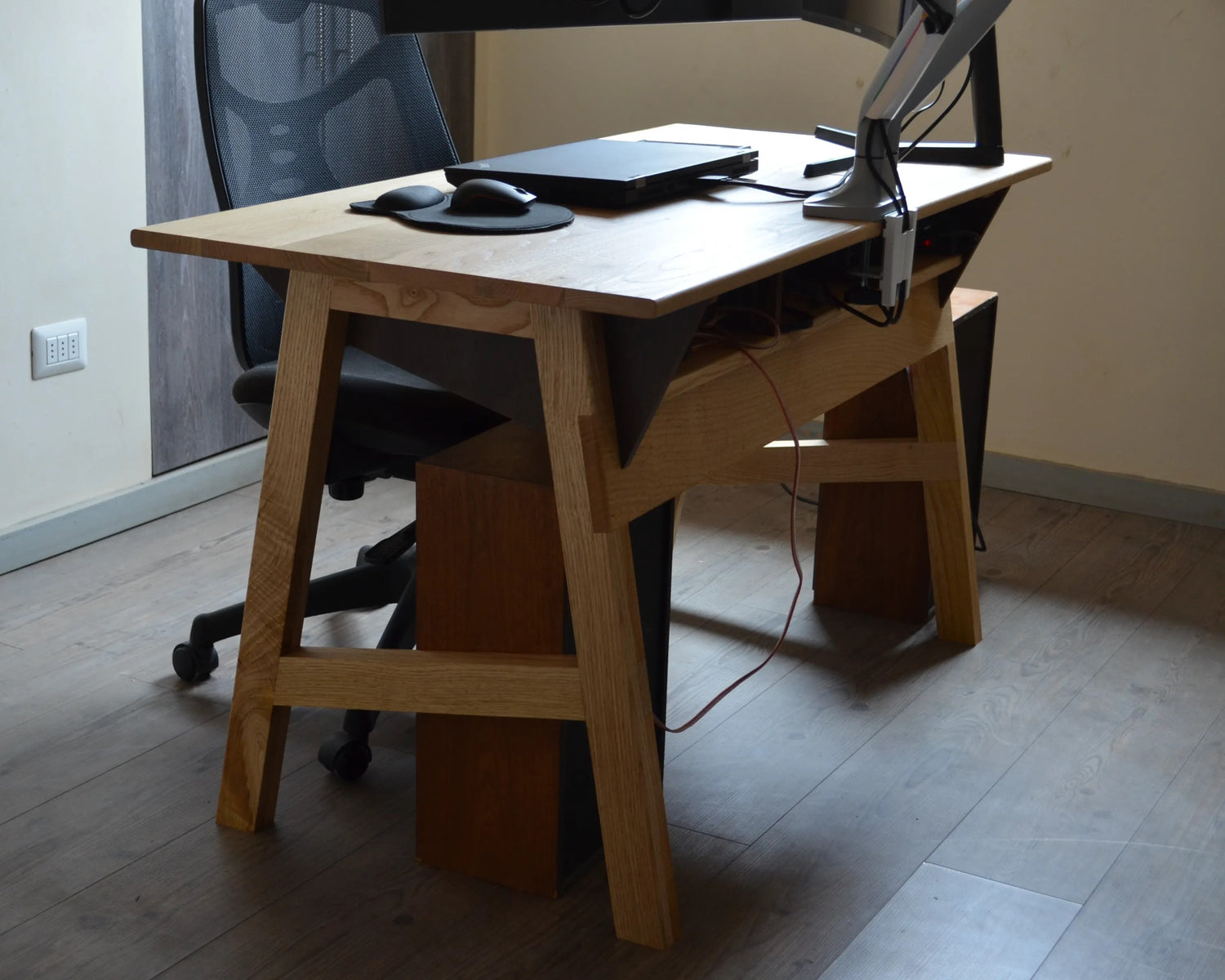 Escritorio de castaño con gestión de cables y diseño vintage