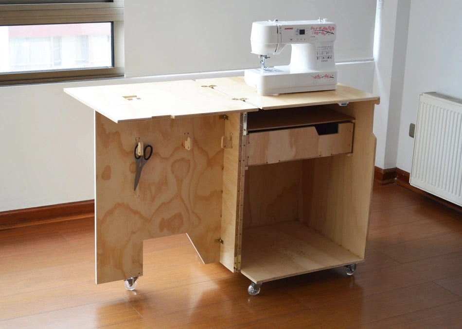 Este escritorio une practicidad y creatividad con cubierta desplegable y ruedas para fácil movilidad. Su interior organiza máquinas de coser y accesorios esenciales, manteniendo todo ordenado y accesible.