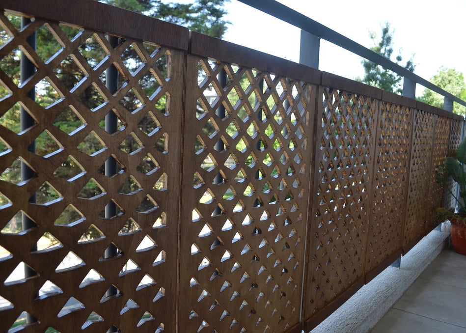 Diseño con rombos decrecientes que regula luz y visibilidad: más transparencia arriba y mayor privacidad abajo. Una baranda que combina seguridad, funcionalidad y un carácter estético distintivo.