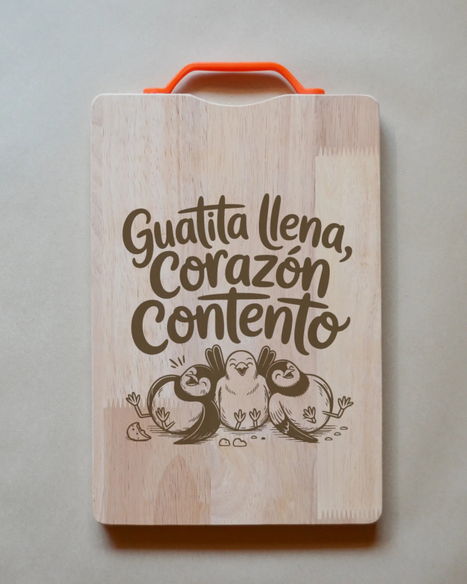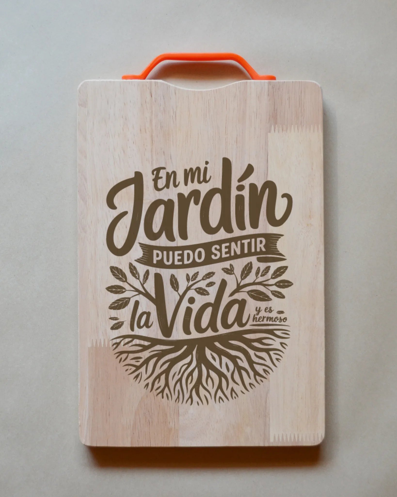 Tabla de madera natural con superficie lisa y vetas únicas. Cada una se graba con láser, trazando líneas finas que marcan el diseño con precisión y permanencia. La textura de la madera aporta calidez y contraste, realzando cada detalle del grabado.