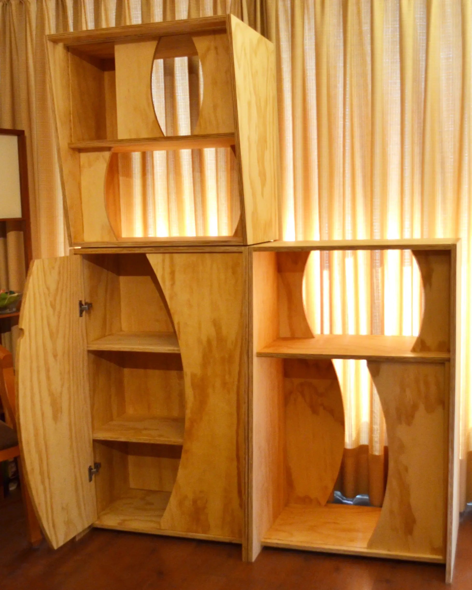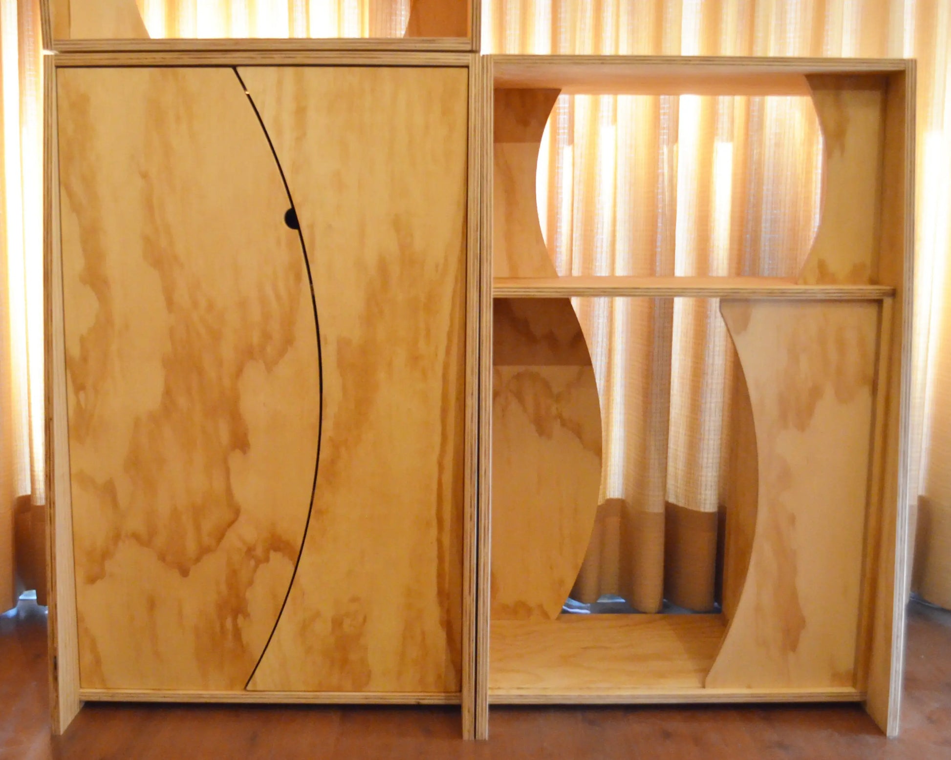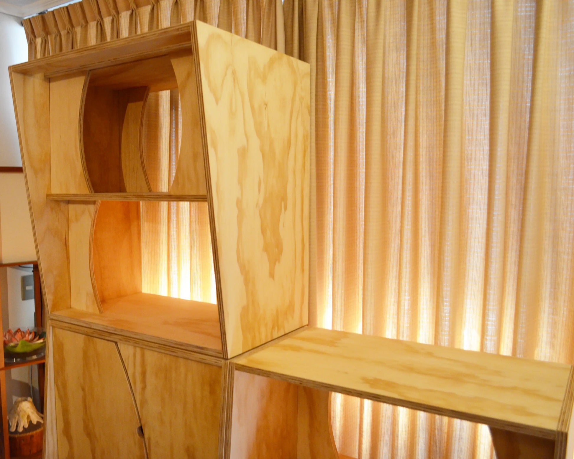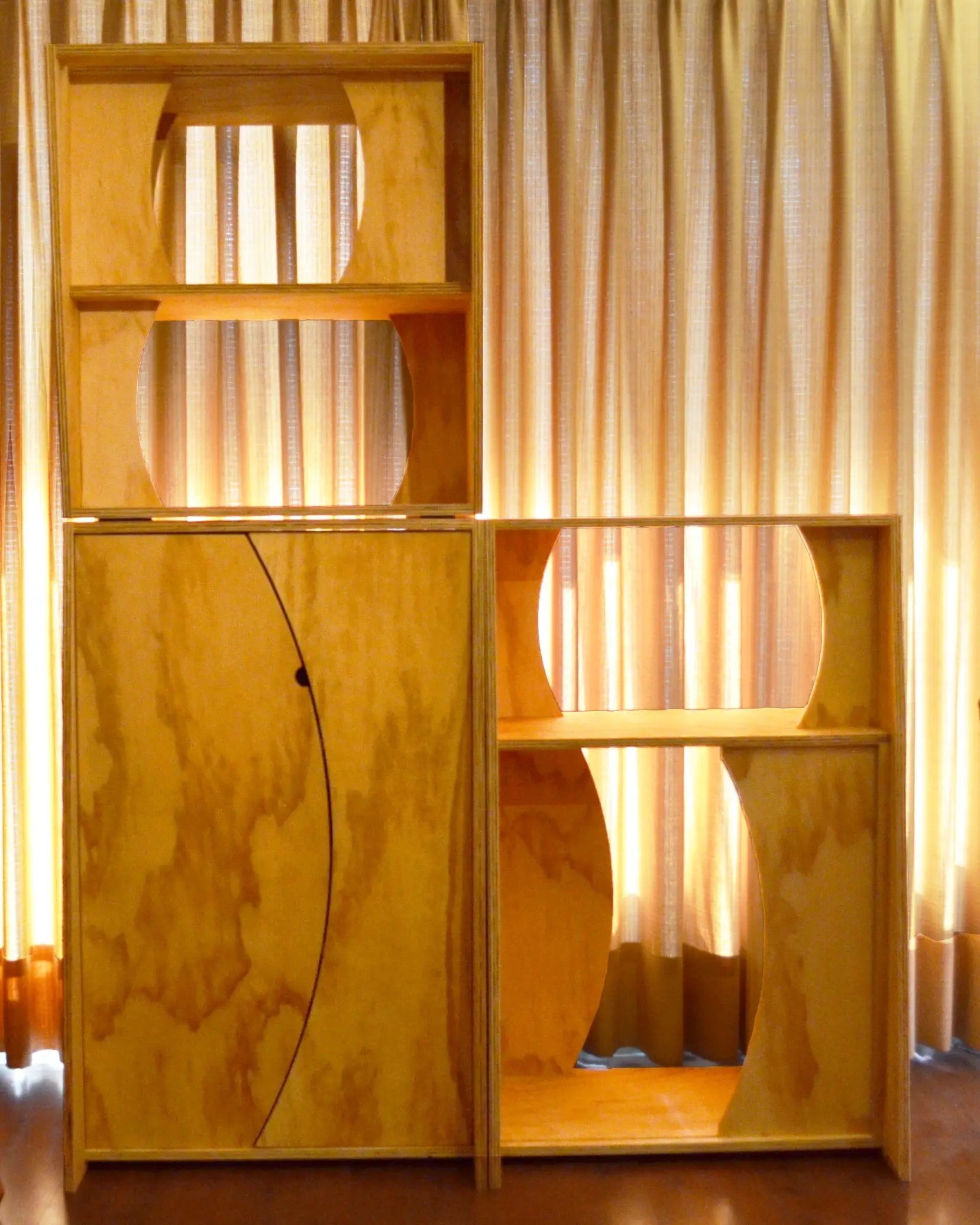 Un proyecto único y especial, inspirado en la geometría de la Flor de la Vida. Su estructura modular está pensada para transmitir dinamismo y movimiento: las piezas se pueden mover, deslizar y recomponer, generando distintas posiciones y figuras dentro del mismo mueble. Además, contiene un par de funciones secretas que lo vuelven aún más sorprendente.