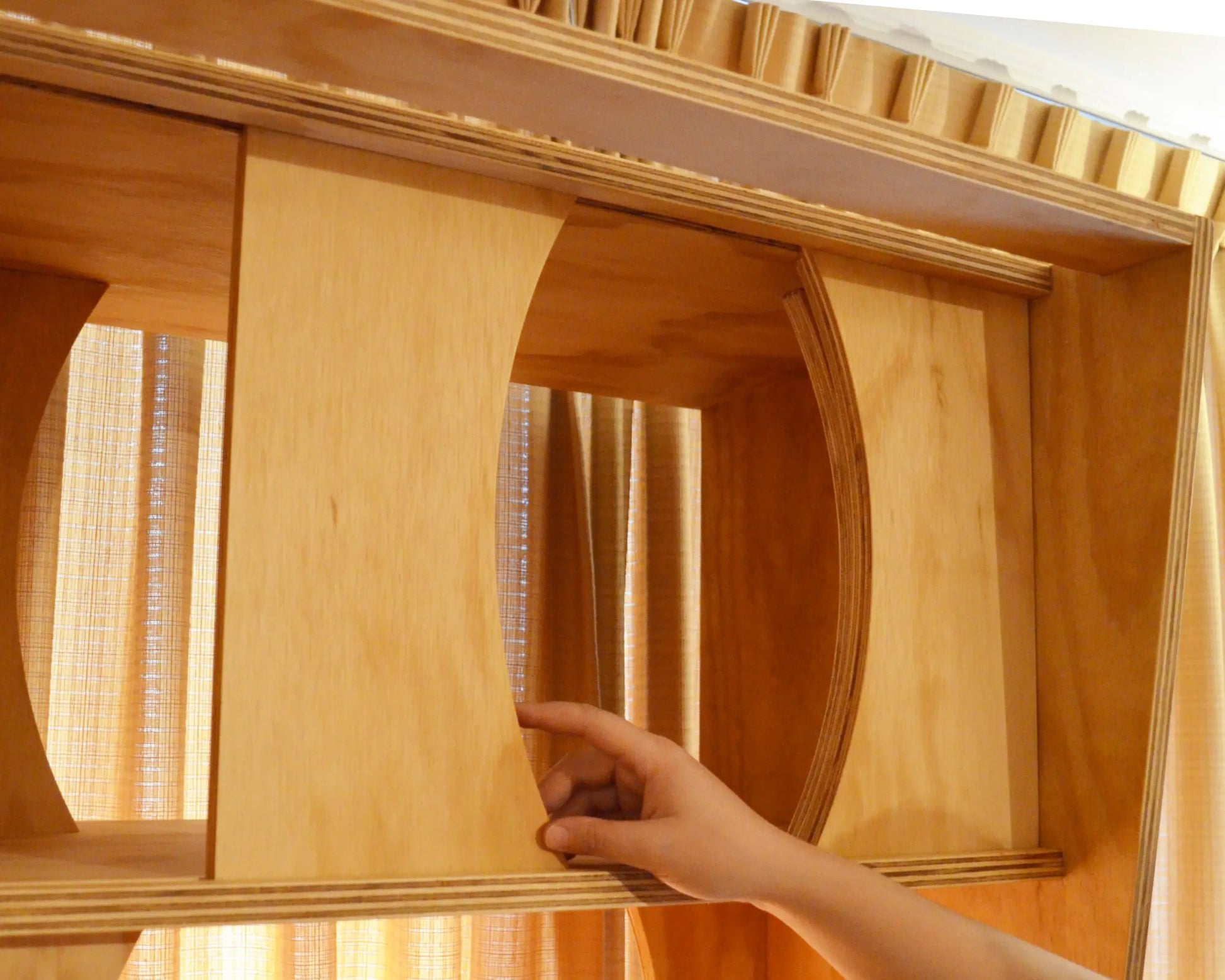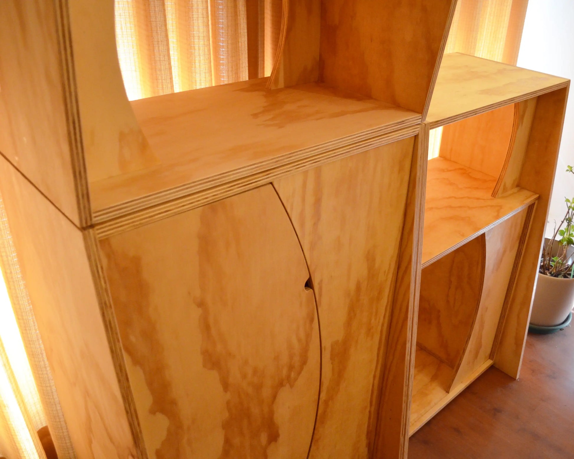 Fabricada en terciado de pino mueblista de 18 mm de espesor, resistente y de gran calidad estética. El acabado con aceite cera satinado resalta la calidez natural de la madera y protege la superficie para un uso cotidiano.