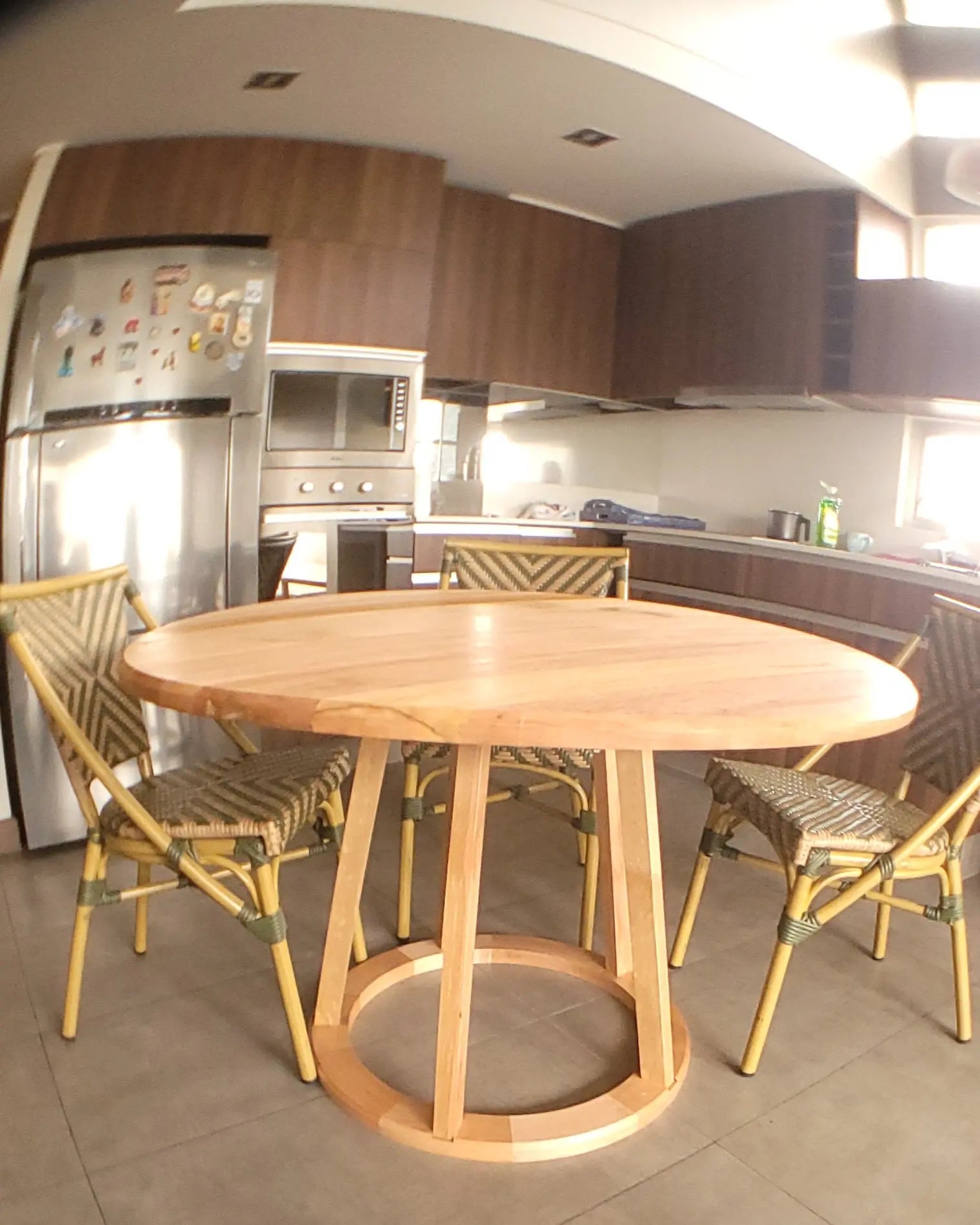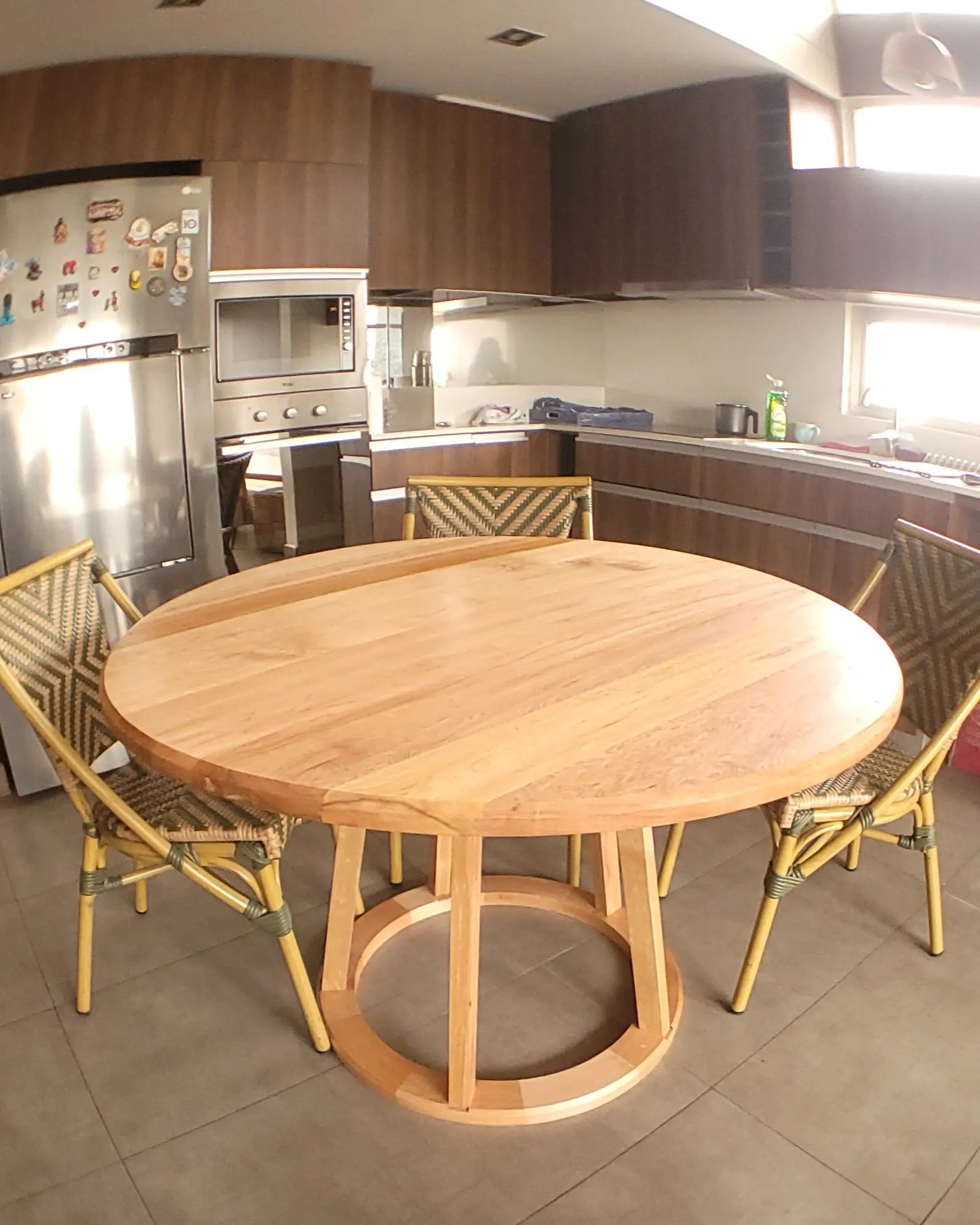 120 cm de diámetro, 3 cm de espesor y 75 cm de alto. Formato ideal para 4 a 6 personas, cómodo y equilibrado para reuniones cotidianas o encuentros especiales.