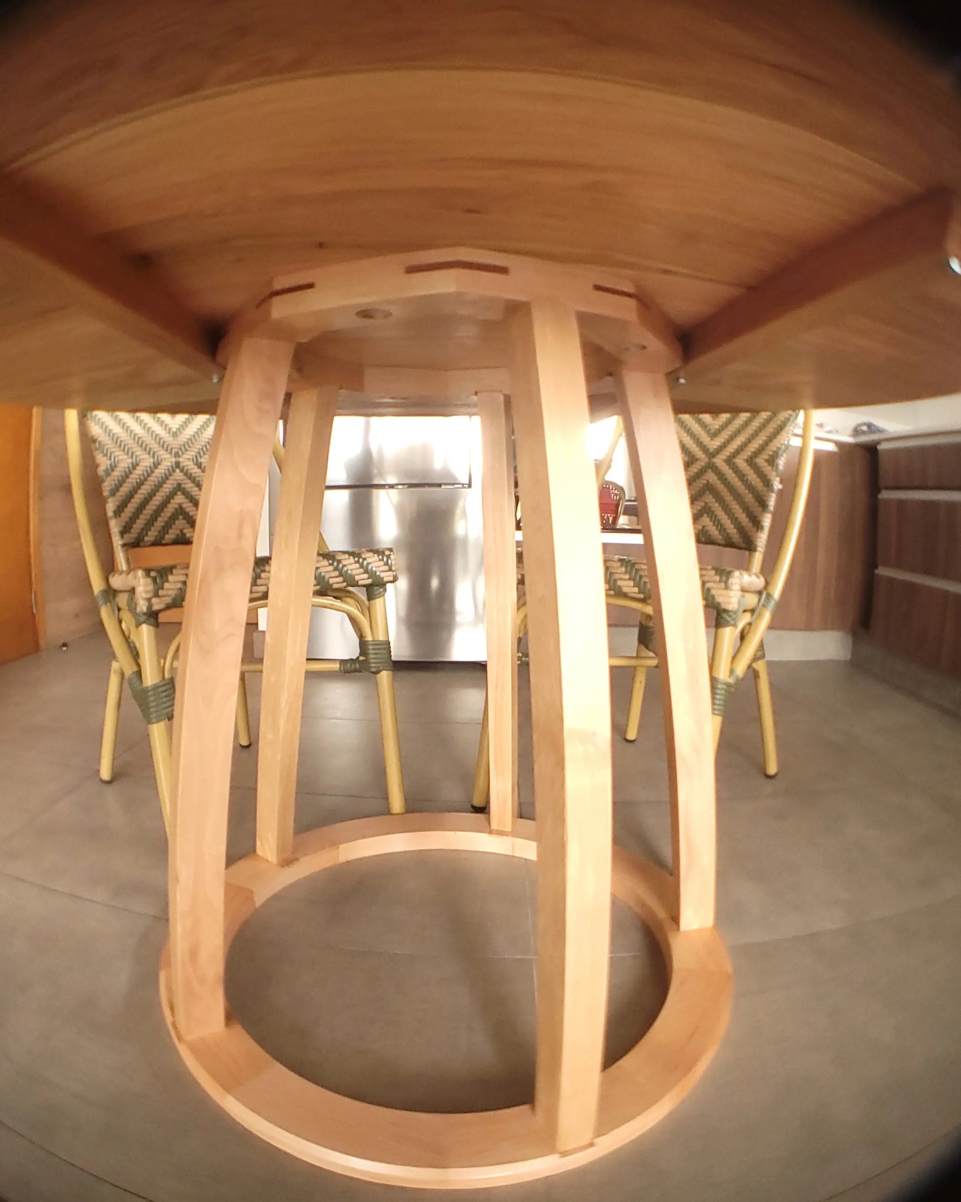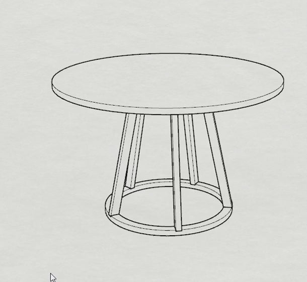 Exclusivo y elegante: una cubierta redonda apoyada sobre una pata central circular compuesta por cinco pilares. Este diseño no solo aporta carácter y estilo, sino también ergonomía, ya que permite libertad de movimiento para las piernas y pies.