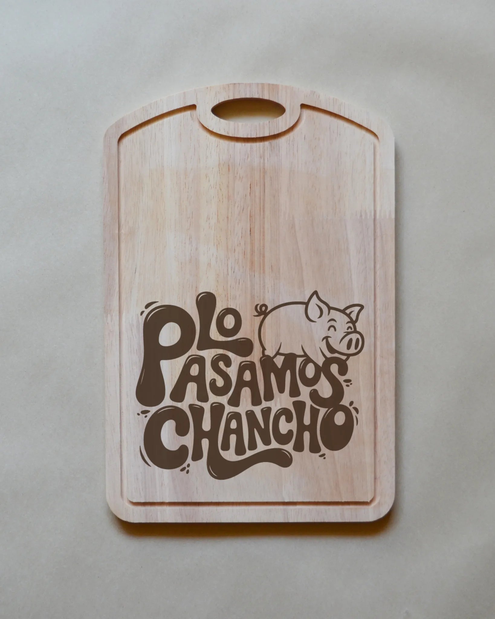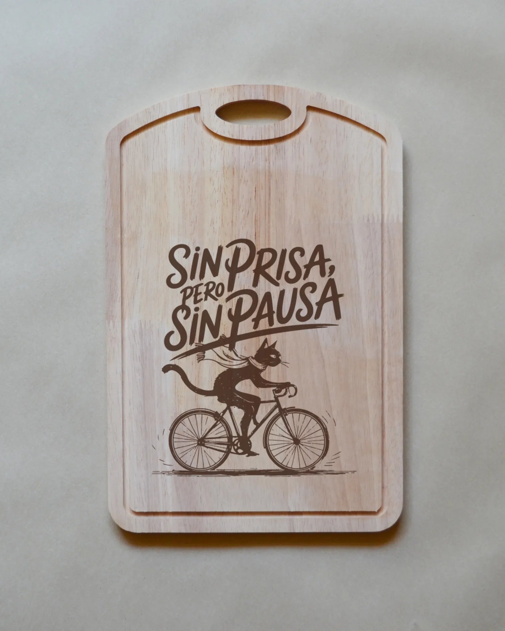 Tabla de madera natural con superficie lisa y vetas únicas. Cada una se graba con láser, trazando líneas finas que marcan el diseño con precisión y permanencia. La textura de la madera aporta calidez y contraste, realzando cada detalle del grabado.