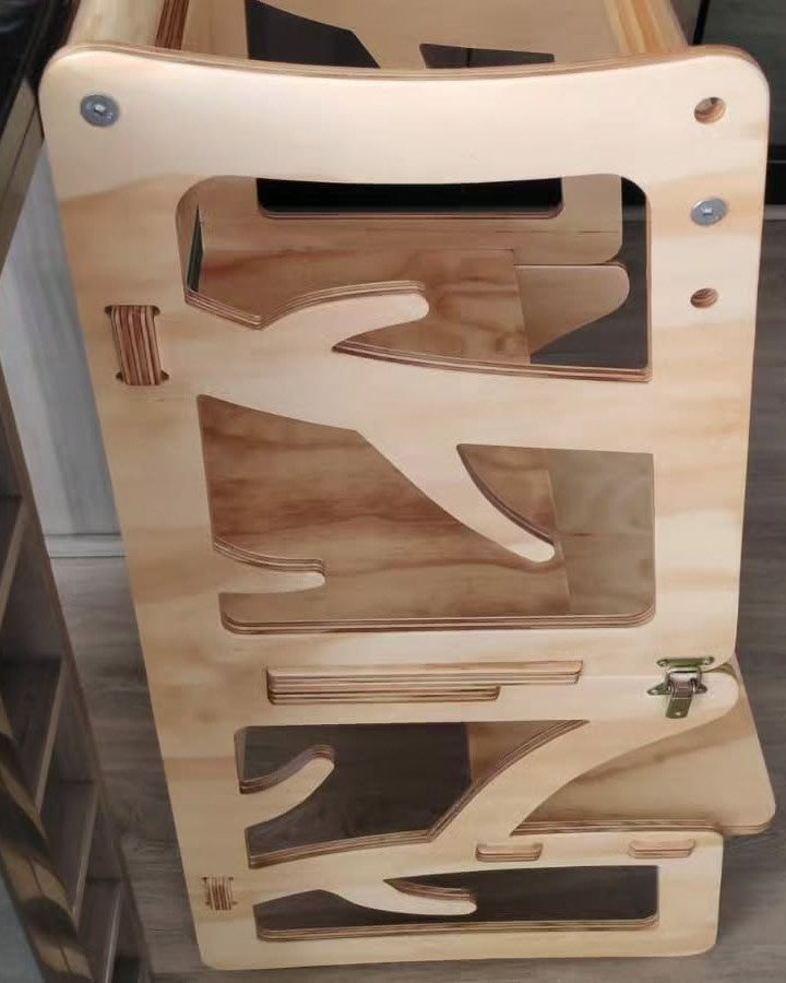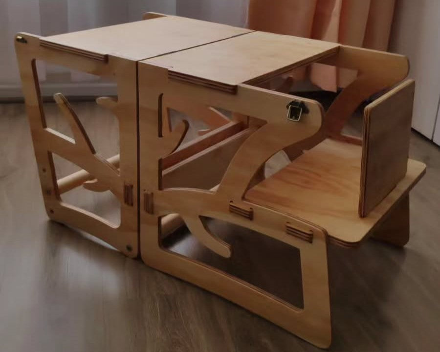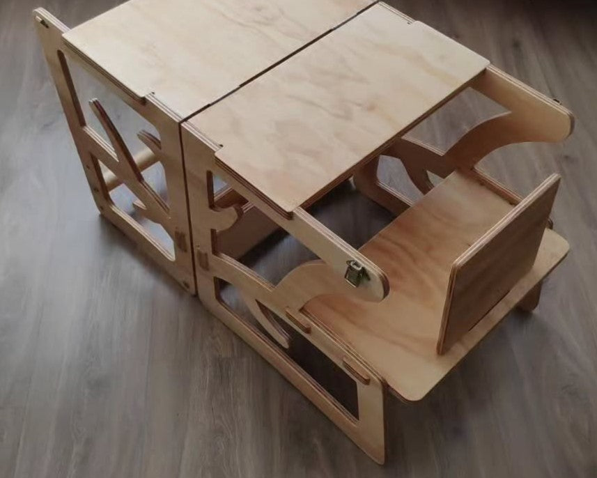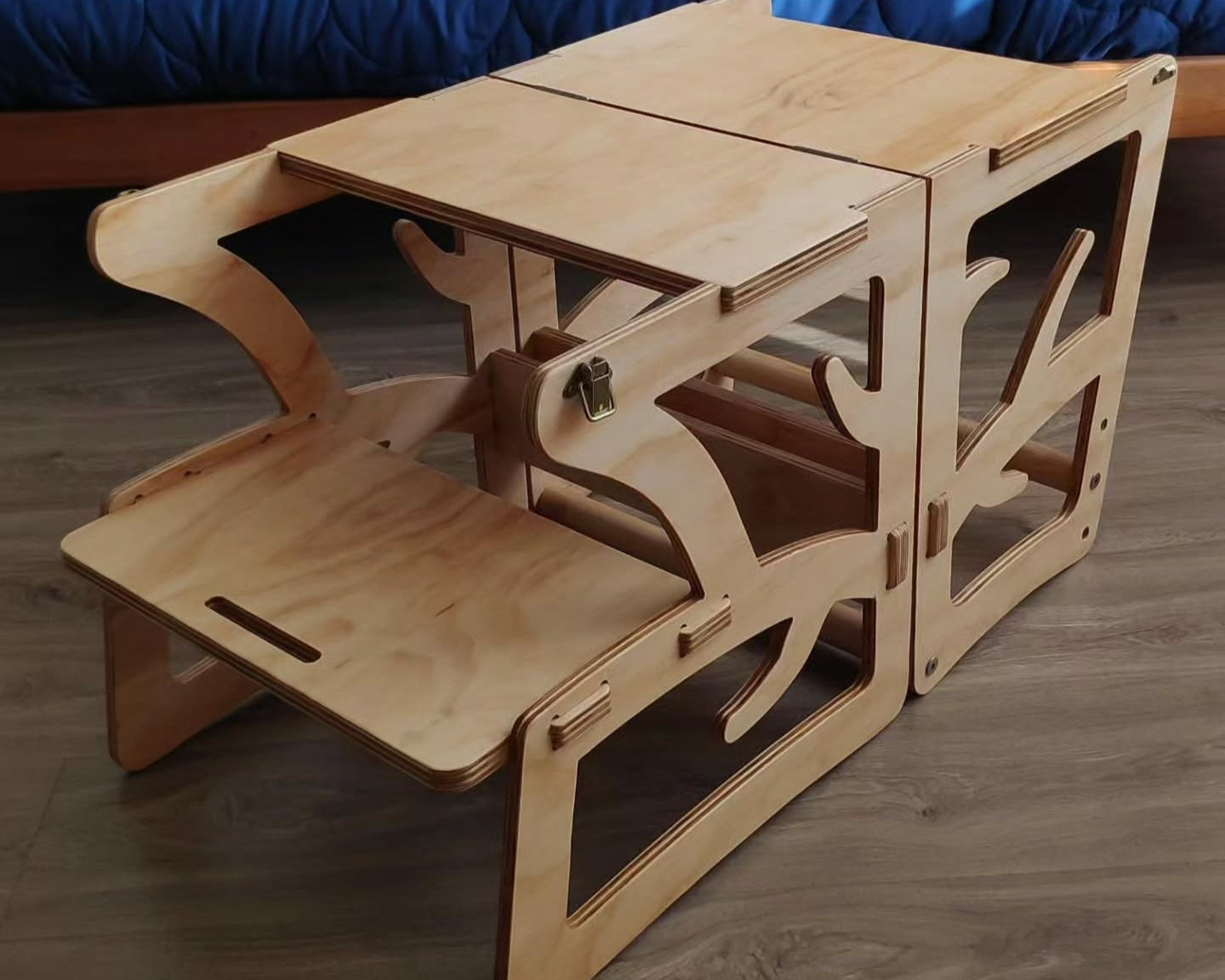 Inspirada en las ramas de un bosque, la torre evoca un espacio que se puede recorrer, escalar y transformar. Su diseño versátil permite múltiples configuraciones: puede funcionar como torre de aprendizaje y también convertirse en una mesita con silla, con o sin respaldo, aprovechando al máximo los espacios y posibilidades en un mismo mobiliario.