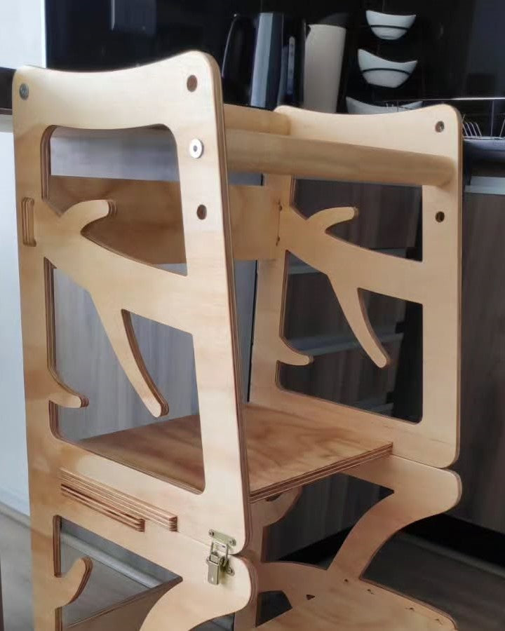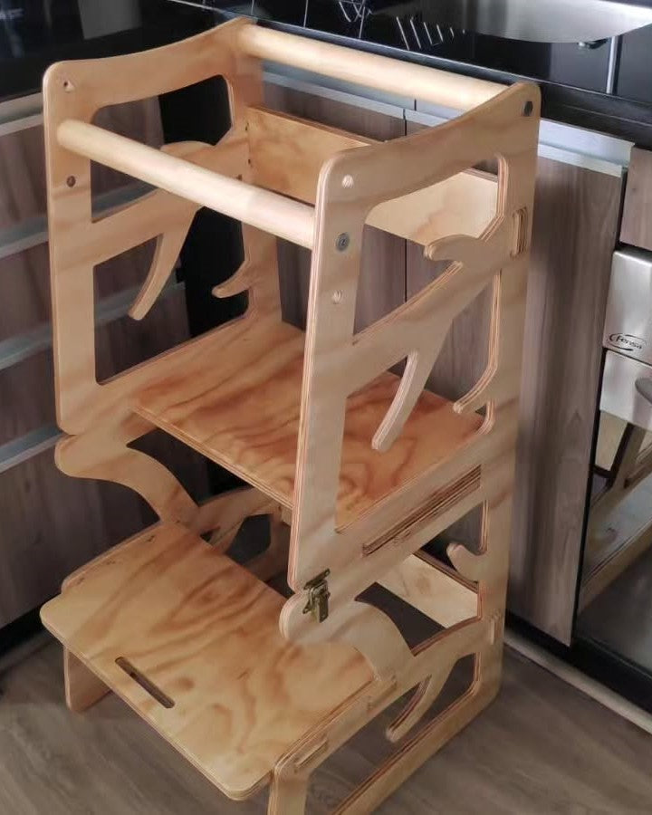 La torre de aprendizaje acompaña a niños y niñas en sus primeras exploraciones, permitiéndoles alcanzar superficies más altas con seguridad, participar en actividades cotidianas y fomentar su autonomía. Además, al transformarse en mesa y silla, amplía las posibilidades de juego, estudio y creatividad.